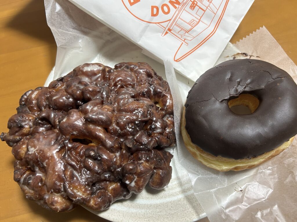 ランディードーナツを買ってみた!右はチョコレイズ、左はアップルフリッター。アップルフリッターの大きさに驚愕!